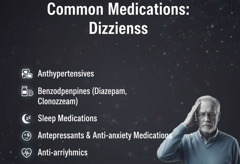 داروها مسئول بیش از ۵۰٪ موارد سرگیجه در سالمندان هستند. معمولاً ترکیب چند دارو شدت علائم را افزایش میدهد.